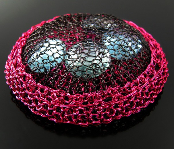 If you think that was it, you are wrong. What I like about the wire knit structure is that you can bend it, fold it, unfold it, and if you are being careful about it, it won't kink and break right away. Stretching is not always that good an idea, but I didn't need to stretch anything here. I pushed the bottom of the pink part in, I pulled it back out, I flattened the rim, I pushed the black part in, I put "pleats" in .. in other words, I had fun.
